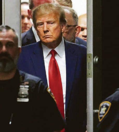 DISGRACED former President Donald Trump sat stony-faced as he appeared in court to deny 34 felony charges yesterday. In an extraordinary moment in US history, the tycoon was fingerprinted but spared the humiliation of having his mugshot taken before he faced a judge in New York. The 76-year-old, impeached twice by the House but never convicted in the Senate, is the first sitting or ex-leader to face criminal charges - including falsifying business records and conspiracy. The arraignment unfolded amid high security, coming two years after Trump's supporters stormed the US Capitol in a failed bid to halt certification of Joe Biden's election win. And while he appeared in the court, White House stuck to its policy of staying silent on the unfolding drama. After raps relating to hush money payments to porn star Stormy Daniels and Playboy model Karen McDougal were read out, Trump pleaded: "Not guilty." Both claim they had affairs with him before he entered politics and were paid to be quiet ahead of his 2016 election win. The payments were wired to Ms Daniels and Ms. McDougal in a deal with National Enquirer magazine, which Trump is accused of conspiring with. Secret Service agents escorted the ex-leader from Trump Tower on Fifth Avenue to the courthouse. His 11-vehicle motorcade arrived at the district attorney's office, part of the Manhattan Criminal Courts Building, at 1.30pm. Trump travelled alone as his lawyers, Todd Blanche and Susan Necheles, sat in the vehicle behind.