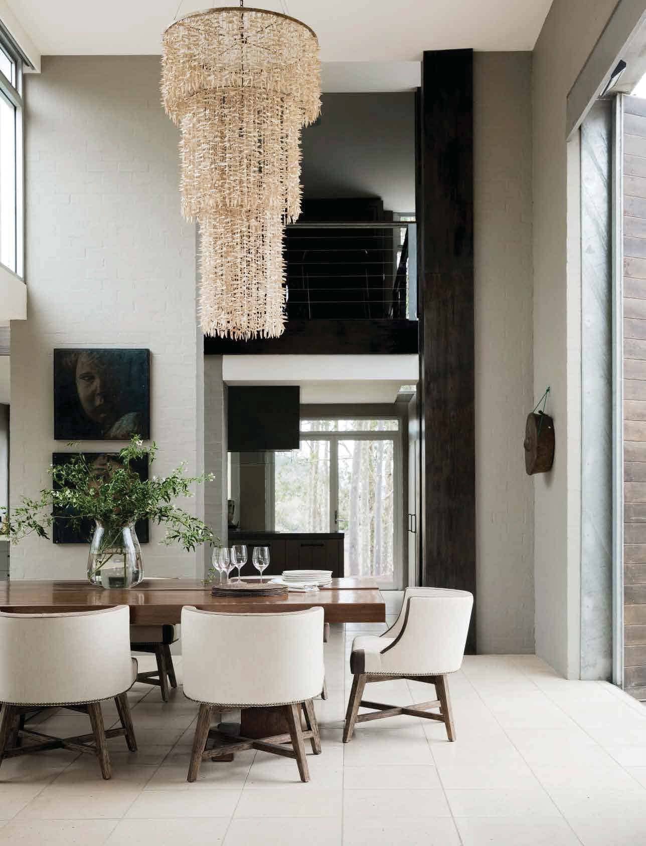 DINING This double-height room plays host to a glamorous customised chandelier and Mood dining chairs from Weylandts (now closed). Artworks by unknown artists. BACKYARD The house, designed by Tom Rivard and built in 2000, still looks amazingly contemporary, helped by the refurbished garden by Paul Bangay and the interior tweaks by Thomas Hamel.
