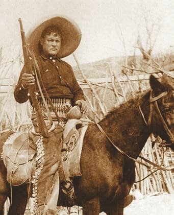 This vaquero was fortunate to acquire a 7x57mm, 1895 Mauser carbine, which was lighter and easier to use on horseback than the long infantry rifle. In the typical fashion of the freedom fighters from south of the border, he’s carrying two bandoleers of cartridges for his carabina. Many of Villa’s and Zapata’s troops carried as many as four or more bandoleros of ammunition.