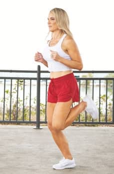 Return to the starting position, quickly repeating with your right heel like you are running.