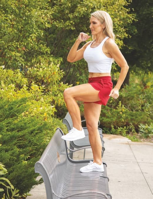 Find a step, chair, or bench that is a height where your knee bends to a 90-degree angle when you place your entire foot on it.