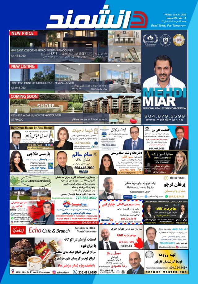 Daneshmand Magazine is a weekly published Persian magazine based out of Vancouver British Columbia, Canada. A Farsi language newspaper with informative articles for those who are Iranian, Afghani, Kurdish, Tajik, & Turkmen. Daneshmand Magazine is the top Persian newspaper for Farsi speakers and those who are Irani, in all of Vancouver. Bringing Iran to Vancouver!