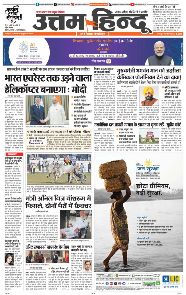 Daily Uttam Hindu one of the oldest newspaper of Northern India, which is being published simultaneously from New Delhi and Jalandhar. It's a 12-page coloured newspaper with a daily combine circulation of 1,00,000 copies (GOI Certified) having readership in New Delhi-NCR Region,Punjab, Haryana, Himachal Pradesh, Jammu-Kashmir,Uttar Pradesh and Rajasthan. Our paper is also a pretigious member of Indian Newspaper Society.