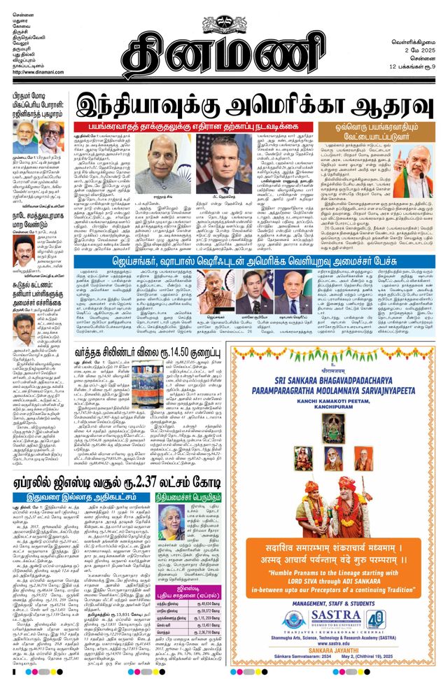 Dinamani is daily Tamil newspaper printed and published from Chennai, Coimbatore, Vellore, Trichy, Madurai, Tirunelveli, Dharmapuri, Bangalore, and New Delhi in India.The newspaper is owned by The New Indian Express Group. Dinamani is a fully developed newspaper with well-separated news, editorial and feature sections...