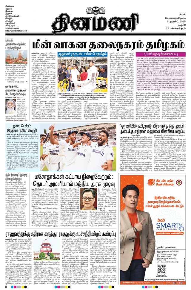 Dinamani is daily Tamil newspaper printed and published from Chennai, Coimbatore, Vellore, Trichy, Madurai, Tirunelveli, Dharmapuri, Bangalore, and New Delhi in India.The newspaper is owned by The New Indian Express Group. Dinamani is a fully developed newspaper with well-separated news, editorial and feature sections...