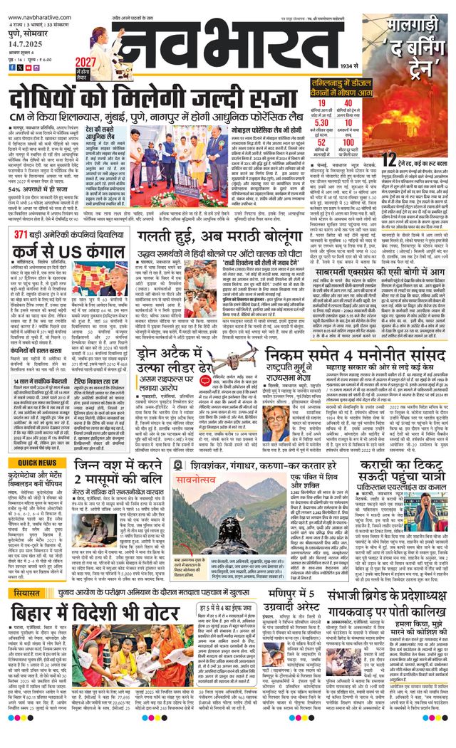 Navabharat (नवभारत) provides all the Latest News in hindi, हिन्दी ख़बर, Taja Hindi Samachar (ताजा हिन्दी समाचार), Breaking News in Hindi, Hindi News (हिंदी न्यूज़) Headlines of India & World on the fingertips through Navabharat Epaper (नवभारत हिंदी न्यूज़ ईपेपर).