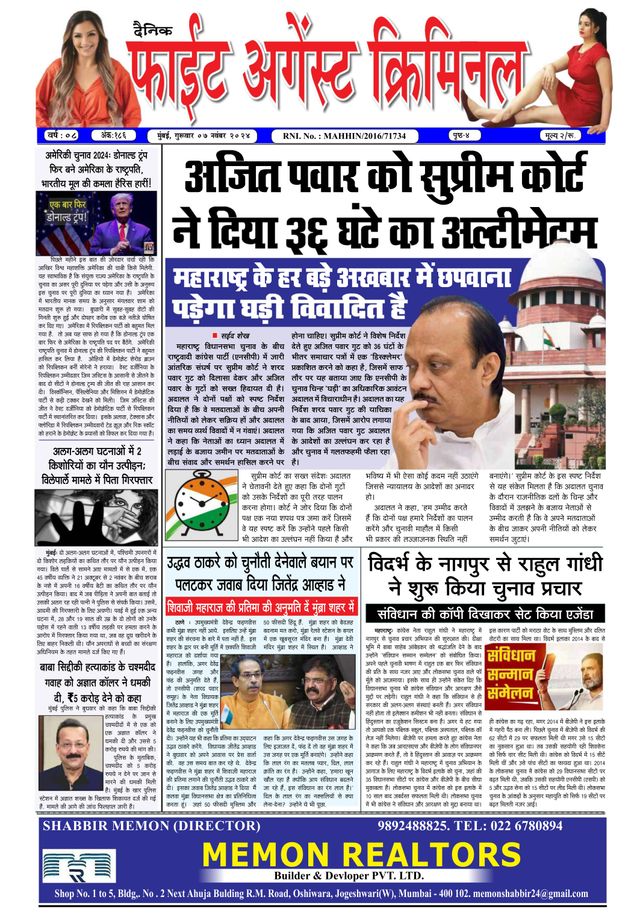 Fight Against Criminal is a broadsheet newspaper published in Mumbai, Maharashtra and circulated in Mumbai – Thane, Mira-Bhayandar, Palghar & Navi mumbai. It is a Hindi Weekly Newspaper and is Published Every Friday. daily website news update The Newspaper was launched on 26 January 2016. It’s one and half years old and still growing and developing each and every day. Fight Against Criminal endeavors to be a truthful, fearless, progressive platform for social-political topics and be a whistle-blower to bring a change & will always do the same. M.S Shaikh Chief Editor