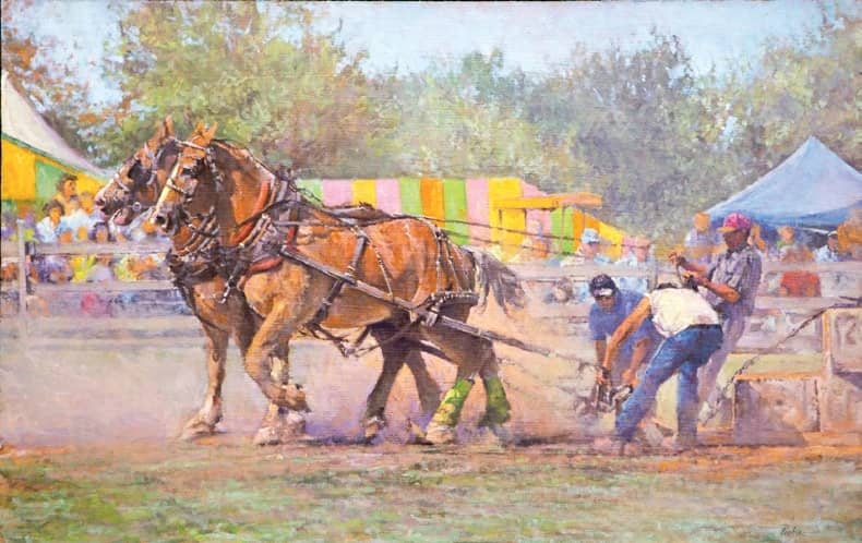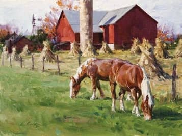 The domesticated horse has been, literally, the workhorse for American farmers. Joel Babb painted The View from the Knoll, Morrill Farm, Sumner, Maine, in 2011 when it was “one of the few working farms left