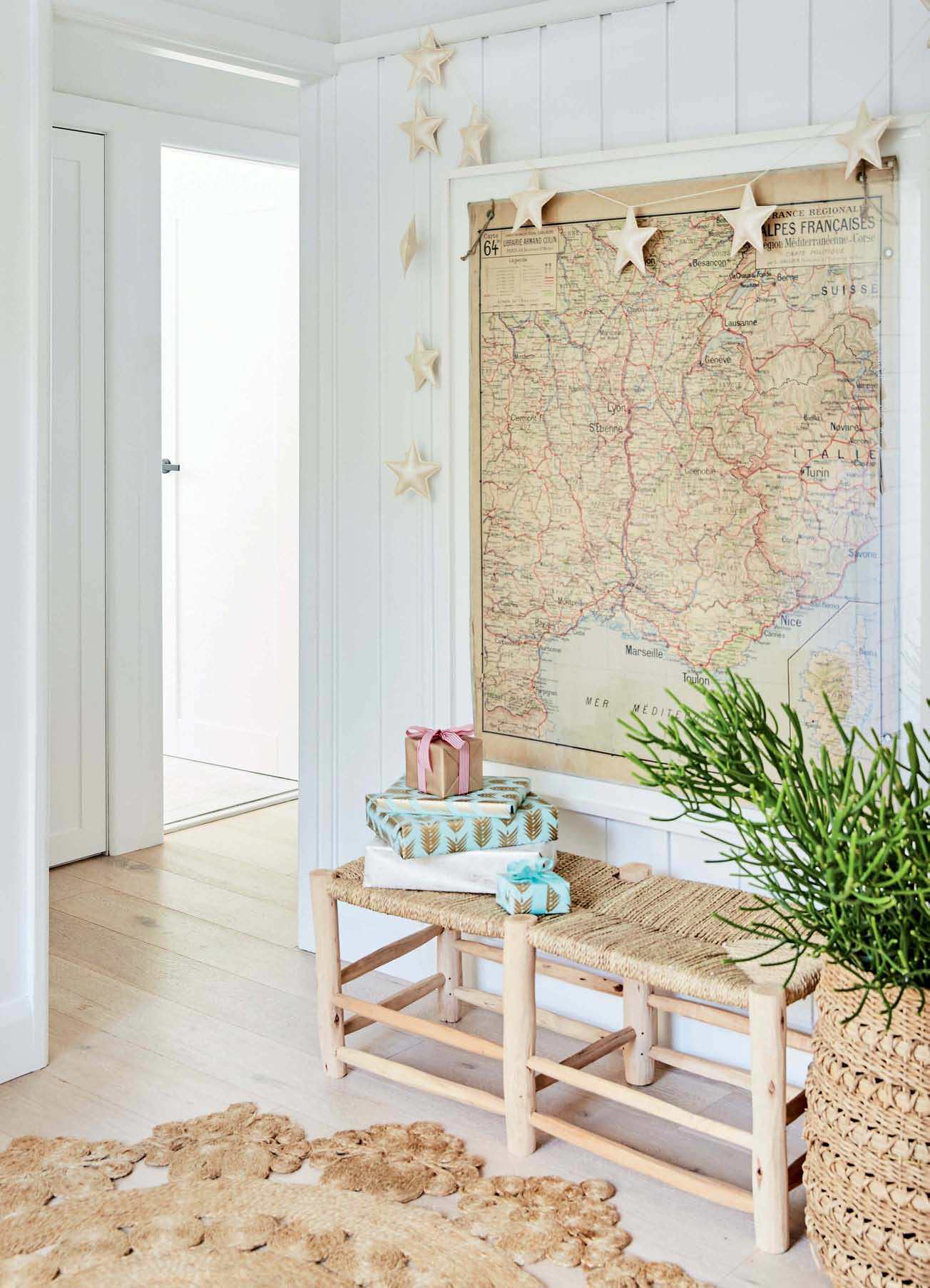 Homeowners Sally and Ben – along with Great Dane Violet (opposite) and now baby Hazel – are enthusiastic entertainers at any time of year, yet Christmas is a chance to really celebrate. Sally, an interior architect, describes her decorating at Christmas as “very casual, natural and coastal”, which ties in with her home’s beachside palette. A festive wreath from Home On Darley (opposite) invites guests into the couple’s renovated ’60s weatherboard, while a star garland from Honeybee Homewares (right) follows the neutral yet inviting scene at the home’s entry, created by a vintage map found in France, an Armadillo & Co rug and a bench seat from Home On Darley.