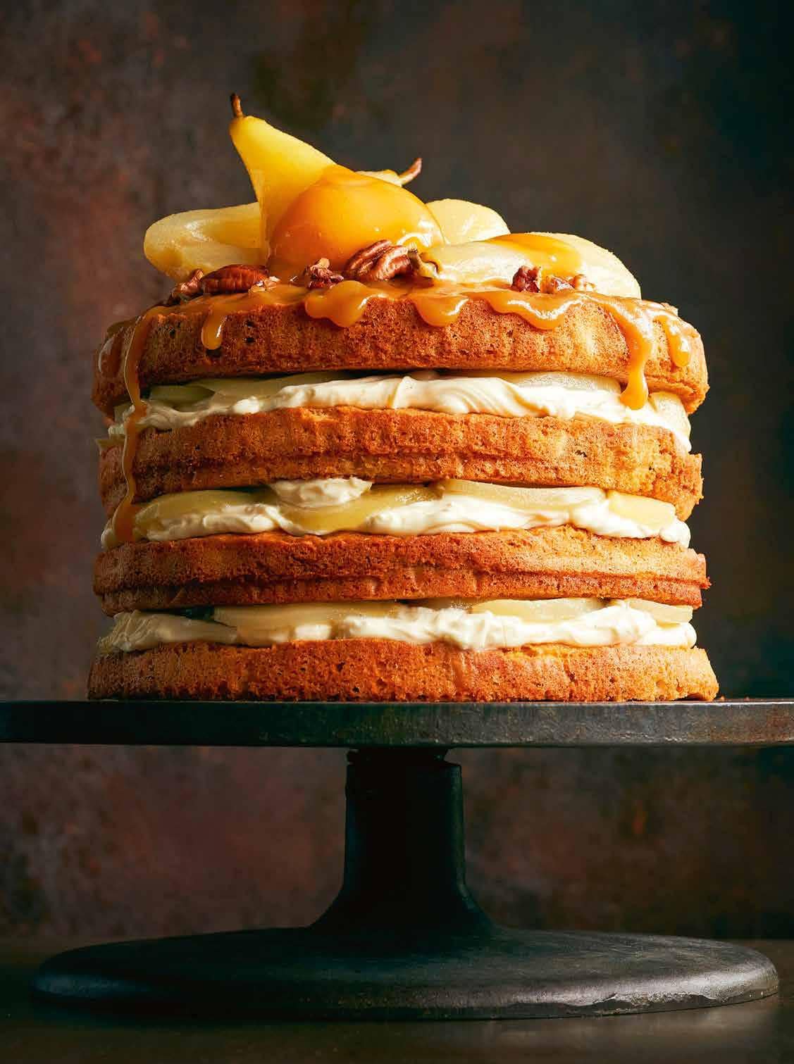 Give sponge a seasonal makeover with this luscious layer cake. The sponges are stacked with mascarpone cream and spiced poached pears, with more piled on top with pecans, and silky smooth salted caramel drizzled all over.