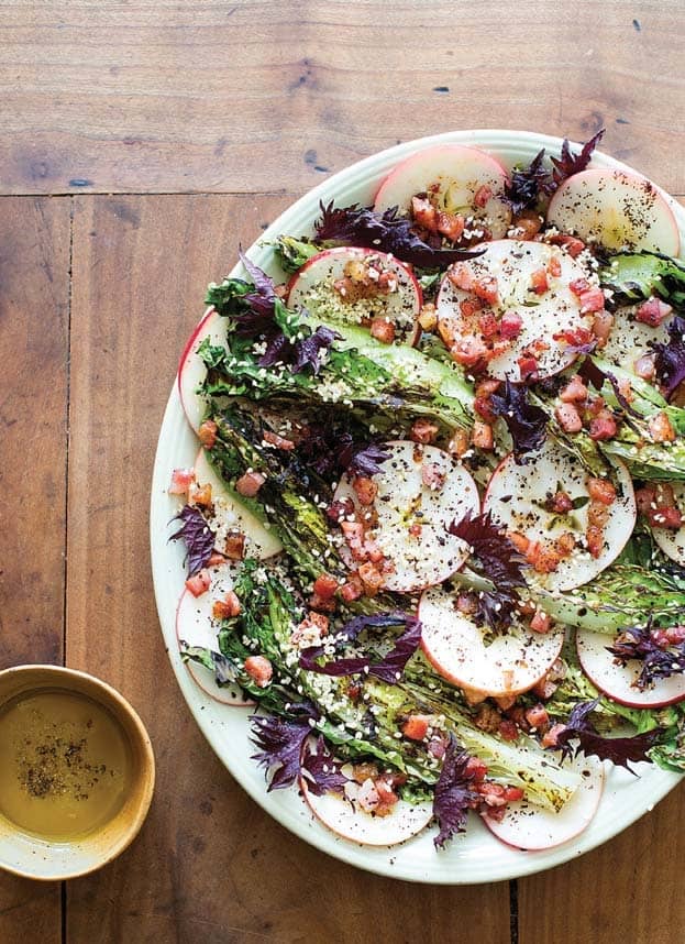 - Meanwhile, thinly slice the apples (equatorially rather than polar), remove the seeds and scatter the slices over the lettuce. Take the pan off the heat and use a slotted spoon to lift the lardons on to the gems, keeping the oil in the pan. Stir the vinegar and mustard into the oil in the pan and drizzle over the salad.