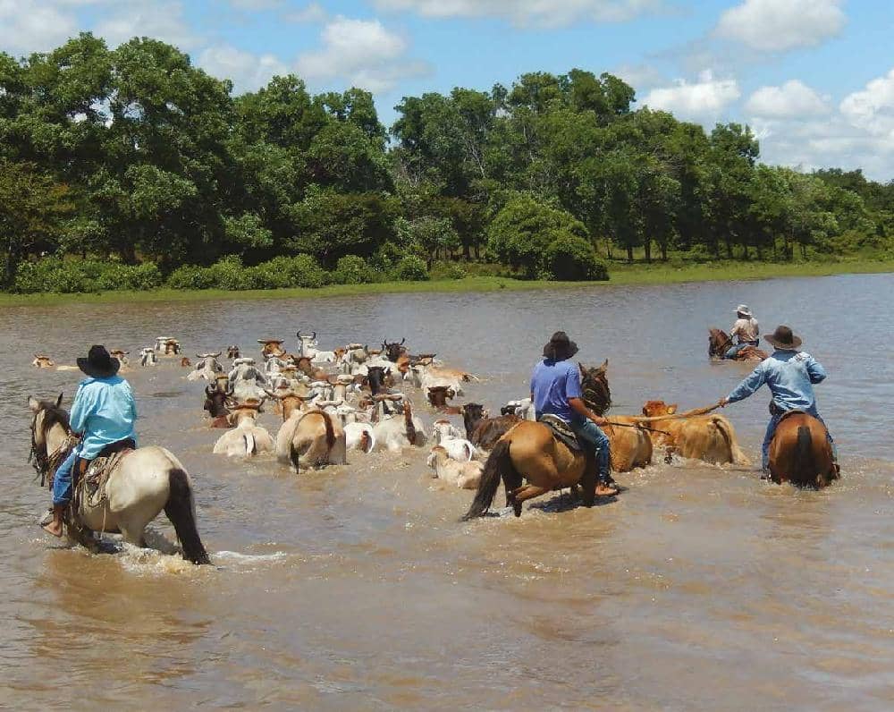 Barefoot, deeply tanned and wearing a denim shirt open to the chest, Seco built to a crescendo. Blinking from the intense midday sun and feeling slightly self-conscious, I belatedly added my voice to the chorus. Above us, a pair of vultures glided languidly in the cloudless blue sky, ready to take advantage of any misfortune. With a final yell, Seco urged us forward and we drove the herd into the murky, coffee-coloured water.