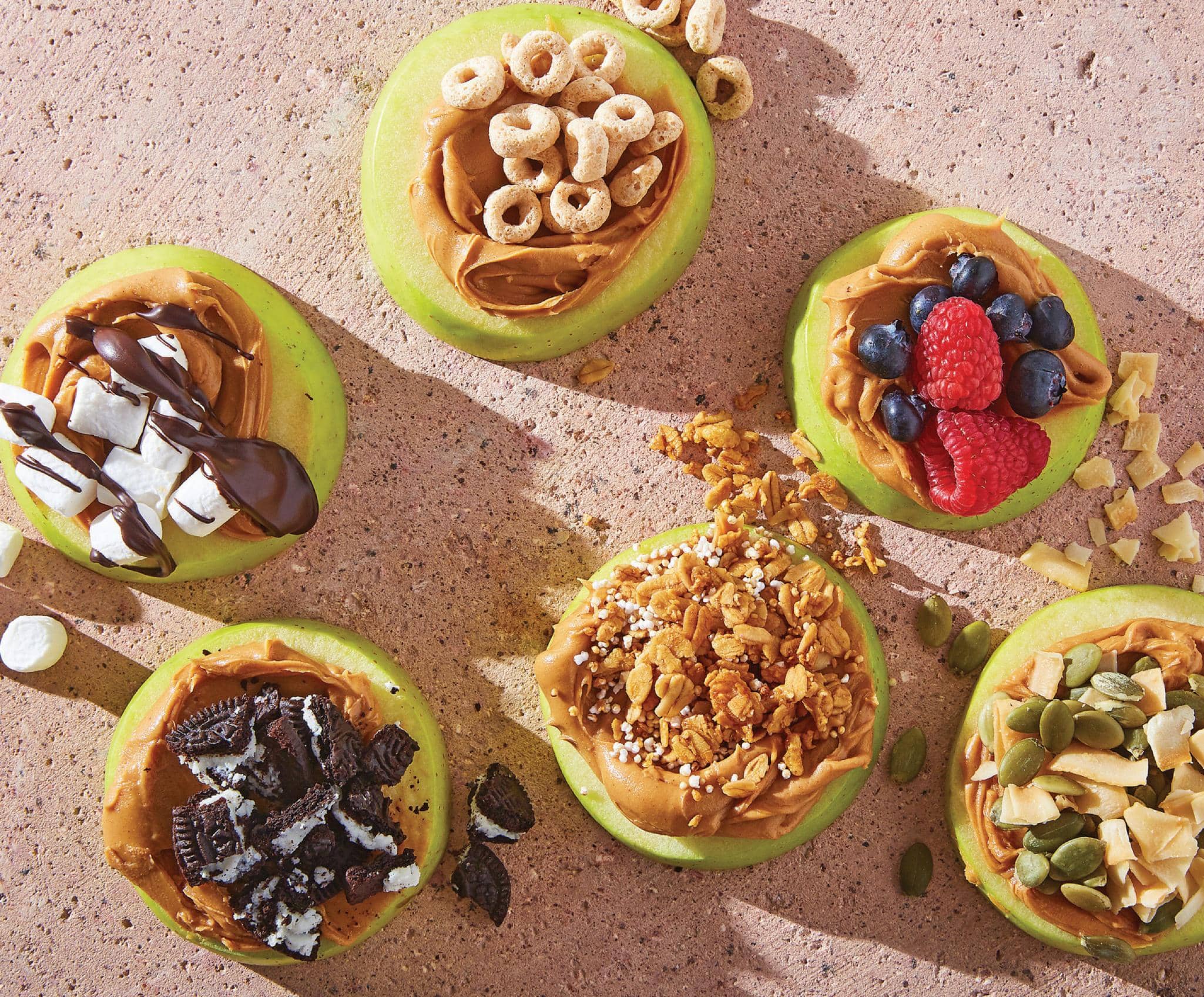 2 Sobre las láminas unta la crema de cacahuate y, sobre esta, algunos de los toppings que te sugerimos.