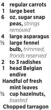 1. Grate carrots. Grate beet. Sliver snap peas. Shave asparagus into thin ribbons. Keep them all separate.