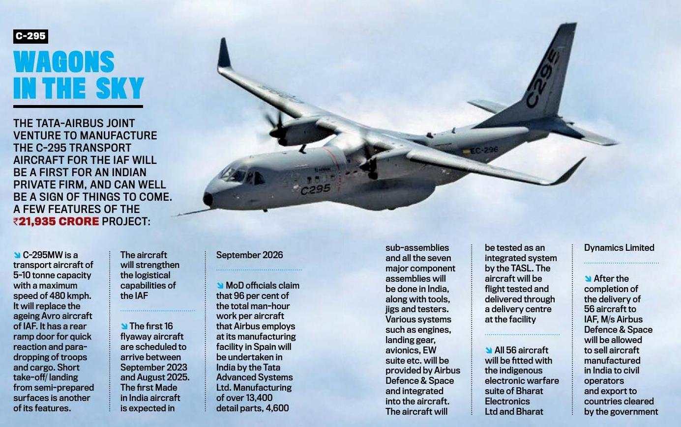 Defence secretary Dr Ajay Kumar said that as part of the contract, 16 aircraft will be delivered in flyaway condition and 40 will be manufactured in India through a joint venture between Airbus and the Indian aircraft contractor, Tata Advanced Systems Limited TASL) and Tata Consultancy Services TCS), led by TASL. The total cost of the project is Rs 21,935 crore. Significantly, this is the first time that a military aircraft will be manufactured in India by a private company.