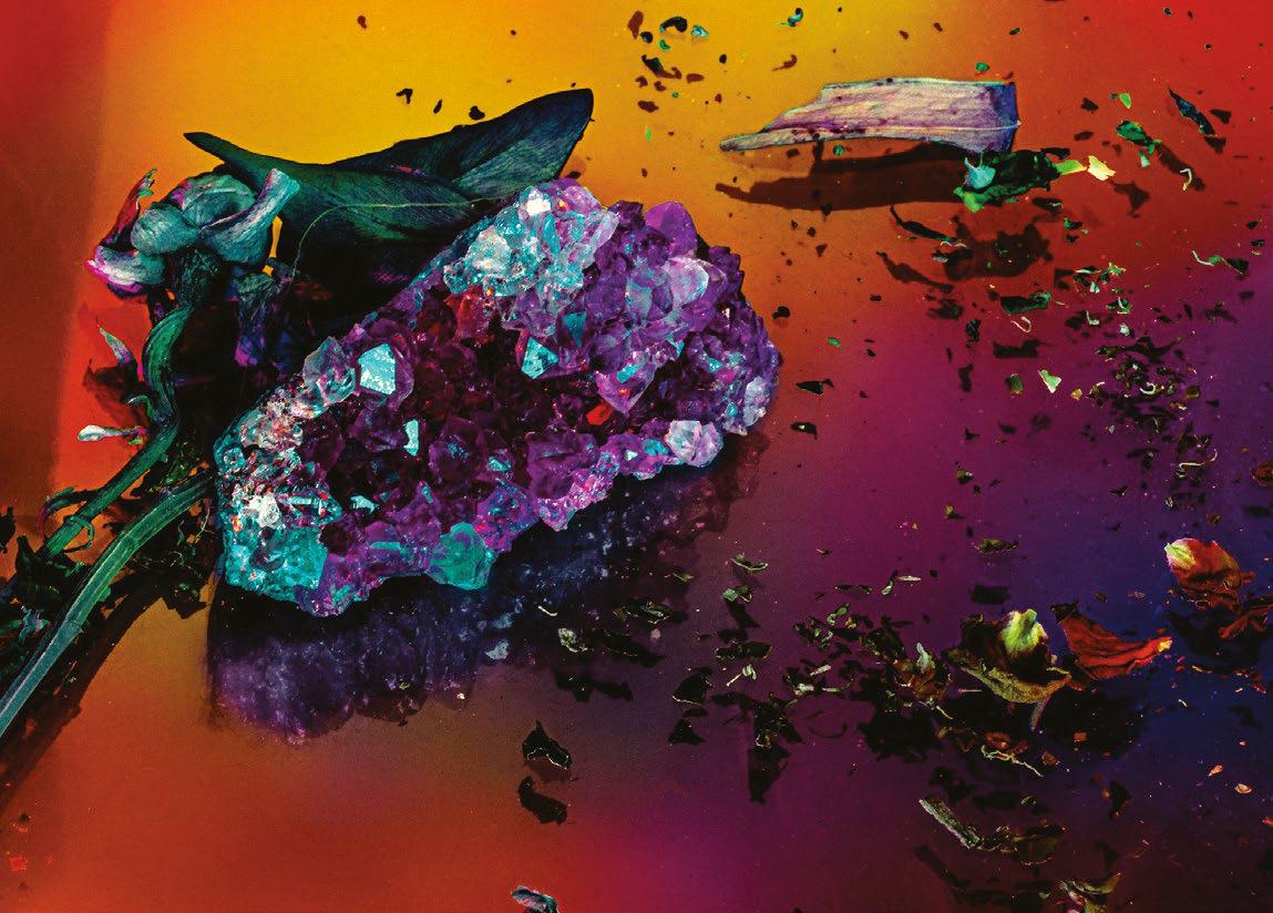 Lucy has obviously had some time to prepare the room a little before I arrive. Three distinct areas are set up side by side: one pale pink with crystals, one dark with a ram’s skull, and the third a light brown setup with old books. Lucy decides to start with the pink backdrop and begins to make a random arrangement of crystals from her bowlful of choices. Is there an end goal, I ask – how do you know when you’re ready to shoot?