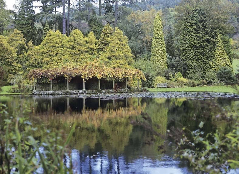 The style is naturalistic with azaleas and rhododendrons under the canopy of evergreens and deciduous trees, accompanied by marginal choices such as lysichitum and gunnera. Golden tones reflect in the water, where you may spot carp swimming in and out of the water lilies, while a small waterfall links the second and third lakes. At the edge of the water is a well-placed bench, a lovely spot to sit and take in the atmosphere.