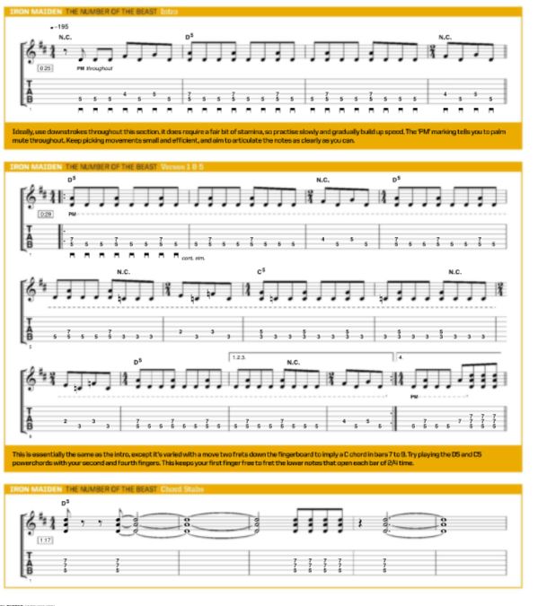 At the core of band is the twin axe attack of Dave Murray and Adrian Smith, who trade rapid-fire solos. Both lead breaks are a challenge for most guitarists, but listen out for Smith’s slightly bluesier phrasing in solo 2. It’s a subtle distinction, and, if you’re tackling both solos yourself, a few rocks of a wah pedal will get you closer to Murray’s tone in solo 1 and help contrast between the two.