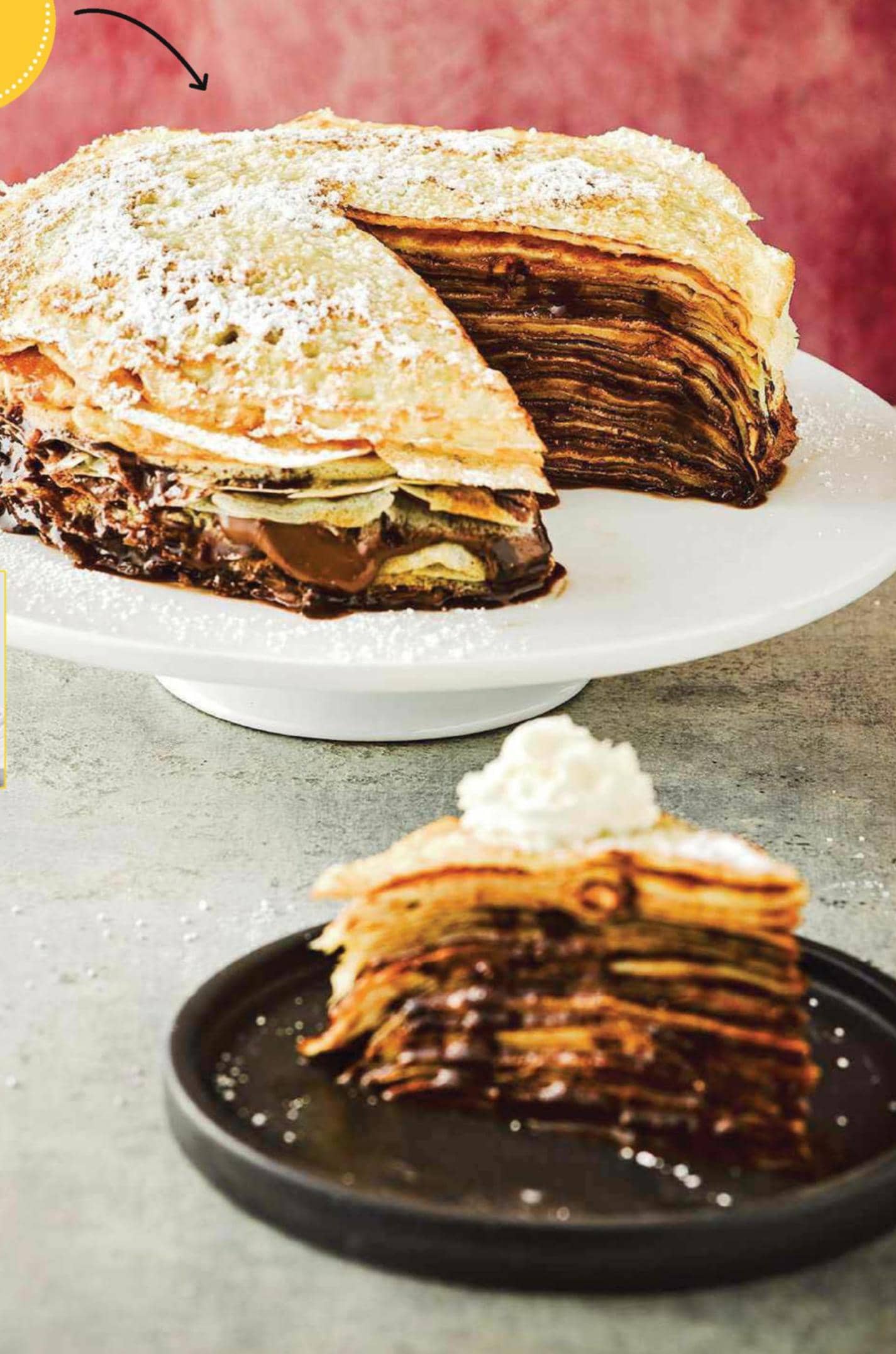 ‘Pancake Day often falls during February half-term, and this pancake cake was born when trying to keep my kids busy on a wet, windy Tuesday a few years back. Give each child a jar of something sweet and spreadable, and as you cook the pancakes, let the kids spread and stack. If you time it right, it should keep them entertained (screen-free) for a good hour. You could also use mashed banana, or lemon curd and cream. One small tip on making the batter: I make mine in a blender or smoothie maker to save on the washing-up, as the batter can be poured from the jug.’