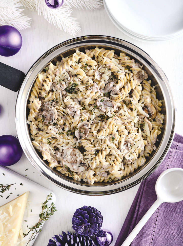 HIERVE dos litros de agua con sal. Cocina la pasta por 12 minutos o según las instrucciones del empaque. ESCURRE y enjuaga bajo el chorro de agua fría. Vierte unas gotas de aceite de oliva y reserva. FUNDE la mantequilla y agrega el aceite. Cocina la carne por 10 minutos hasta que se dore, y salpimienta. RETIRA de la sartén y añade la cebolla y el ajo. Acitrona por 5 minutos. AGREGA los champiñones y cocina por 5 minutos. Regresa la carne y mezcla. VIERTE la crema, la leche y el tomillo. Tapa y cocina por 15 minutos. AÑADE la pasta y rectifica sazón. Cocina por 5 minutos más. SIRVE y espolvorea el queso y decora con tomillo fresco.