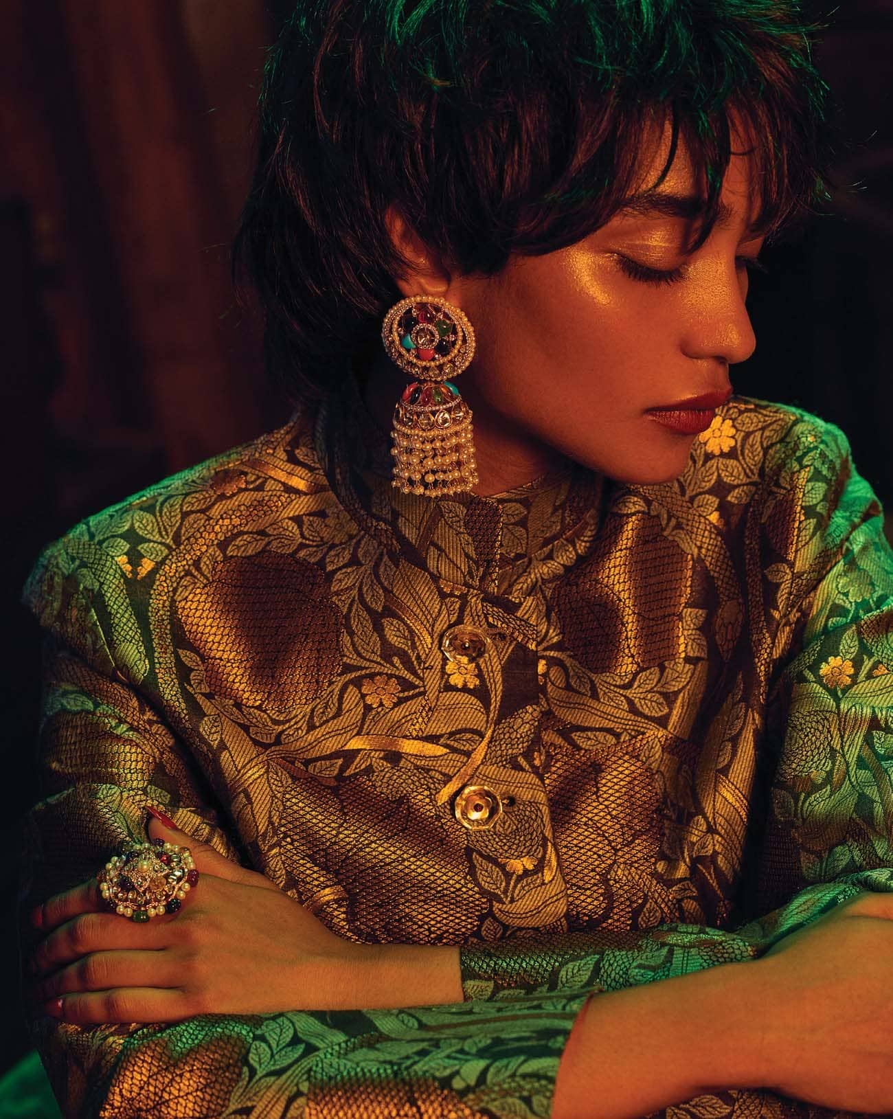 Handwoven Silk Brocade Draped Coat,₹44,500, Payal Khandwala. Laila Navrattan Earrings, price upon request, Signature Jewellery. Necklace (worn as hairband), choker, long necklace, bangles, and ring, all price upon request, Shri Paramani Jewels.