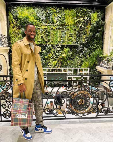 Fieg's corner suite frames sweeping views of the Manhattan skyline with concrete beams and lustrous carpeting, marble and brass. Big-boy toys abound. A turntable is loaded with a limited-edition Kith pressing of the Notorious BIG's Ready to Die, velvet upholstery is adorned with Kith x New York Yankees wool pillows, cacti are potted in Kith terracotta planters, a BMX bike rests on the credenza, collectible figurines by Bearbrick and plaster basketballs by Daniel Arsham - both frequent Kith collaborators - line the window ledges and climb up the wall, a walk-in closet brims with sneakers from floor to ceiling.
