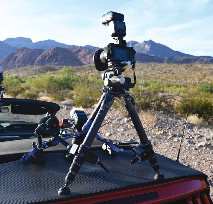The ‘what if’ factor is up there when you have a rolling camera platform, no permit, remote triggering, autofocus, and the loose cannon of Reno, Nevada, photographer and dear friend, MD Welch, helping you out. The only truly stable thing out there was the Gitzo tripod we were using, which was a five-section systematic, bolted to the trunk top of a Ford Mustang. Lots of zip ties were deployed for the three SB-5000 flashes. The main light was the Lastolite Ezybox Speedlite 2 Plus. And then, of course, there was Joli Irvine.