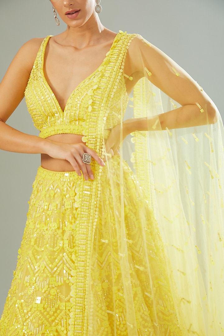 Seema Gujral Yellow Net Embroidered Lehenga Set Featuring a yellow lehenga in net base with geometric cut sequins embroidery and an abstract pattern. It is paired with a matching blouse and a dupatta. Shop Now
