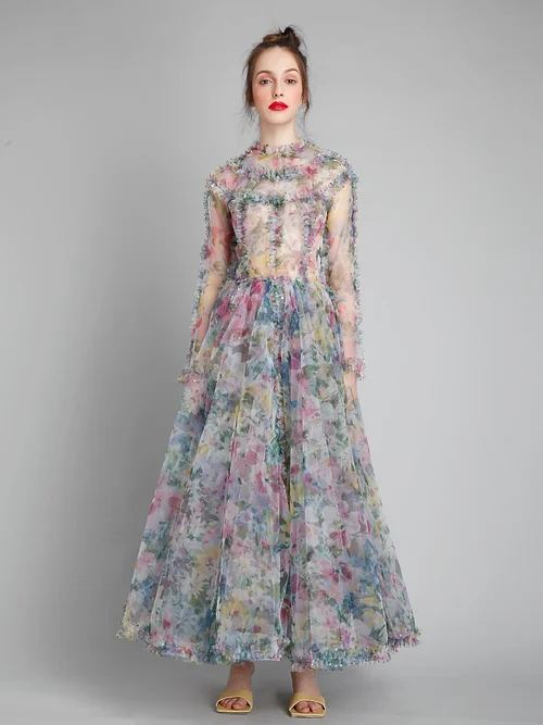 Gauri & Nainika Round neck full sleeves embroidered ruffled midi dress Back concealed zip; Hand embroidered. Shop Now