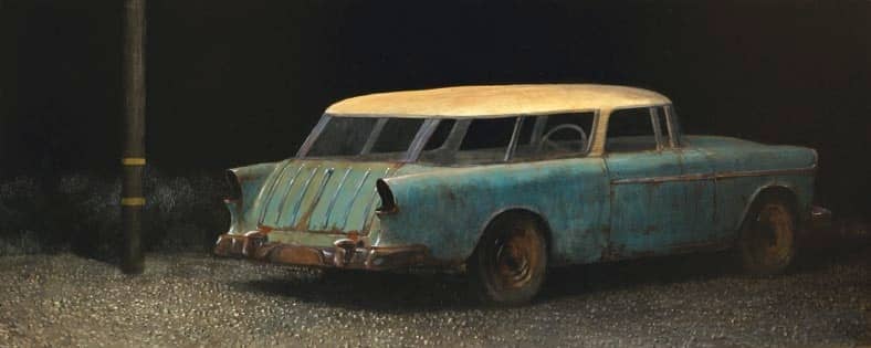 Today, Danny Heller combines architecture and automobiles in his paintings that celebrate midcentury Palm Springs and the area. He says, “Working in a photorealistic fashion, I highlight various elements of midcentury modernism—walls of intricate breeze block patterns, dynamic rooflines of tract homes, fins of a 1958 Cadillac, kidneyshaped swimming pools—and how they combine with the surrounding environment to create an idealized setting. What’s important for me is not just a respectful reproduction of these touchstones of design, but communicating their optimism and continued relevance in our daily lives. In doing so, I’m helping people value the past, aid in its preservation and learn from it in order to build the future.”