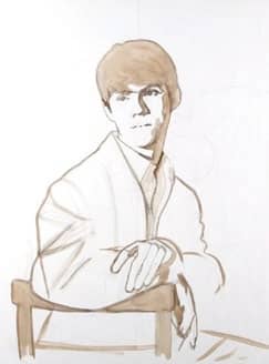 STAGE 1 I typically begin portraits on an overstretched fine linen canvas I have carefully prepared with four to five coats of gesso. Next, I tone the canvas with a semi-opaque turpentine slush of quick-drying foundation white paint tinted with a little bit of cobalt blue. An oversized canvas gives me the opportunity to crop each painting near or upon completion to what has revealed itself to be the perfect composition. I “inked” in my preliminary drawing with a very thin burnt umber wash as I started into paint, keeping things tonal. I used the head, scaled to life-size, to determine the correct proportions for the portrait.