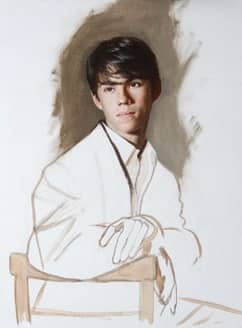 My process for staging and painting a portrait begins with something that excites me. With this portrait, I found immediate inspiration when I saw Jonah under the natural light in my north-lit studio. The work of Raphael, Bronzino, and Pontormo came to mind as I observed his poetic expression, long graceful fingers and the tilt of his head. I loved the simple drama and limited palette of his favorite black leather jacket over a white shirt, which was both modern and classic.
