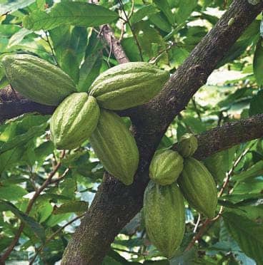 Cocoa trees are not what you might expect – the blush, green and ruby cocoa pods, all within tantalising reach, dangle from the trunk and branches like giant-sized baubles.