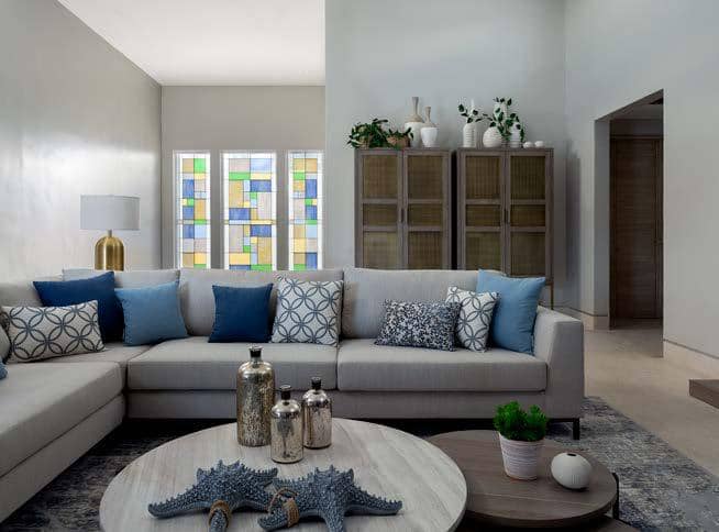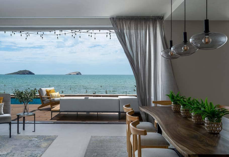 Al acceder a ella, se puede apreciar un amplio vestíbulo que conduce a diferentes espacios, principalmente a la sala y al comedor, donde la vista al mar es espectacular, sobre todo al atardecer, con los tonos cálidos que envuelven al espacio con una acogedora sensación que crean una atmósfera perfecta.
