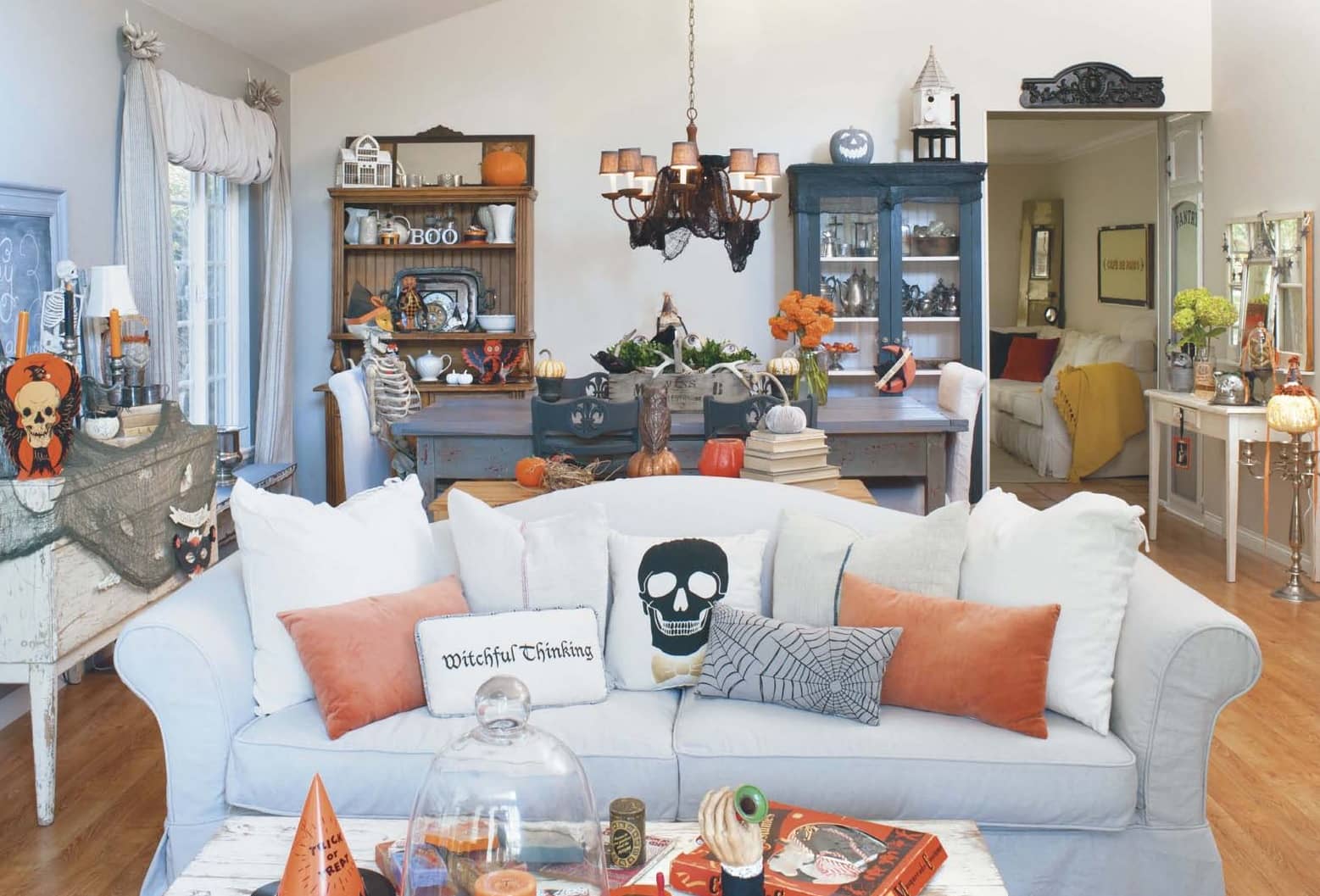 But she doesn’t only decorate for this beloved holiday. “I start decorating for fall on Labor Day weekend, but I wait three weeks after that to start Halloween,” Rosemary says. To accomplish this transition, she ensures that most of her fall décor will easily blend in with her Halloween treasures. Pieces like vintage candelabras, candles, orange pillows, and pumpkins are perfect additions to any autumnal setup, but they also seamlessly transition into an eclectic tribute to All Hallows’ Eve.