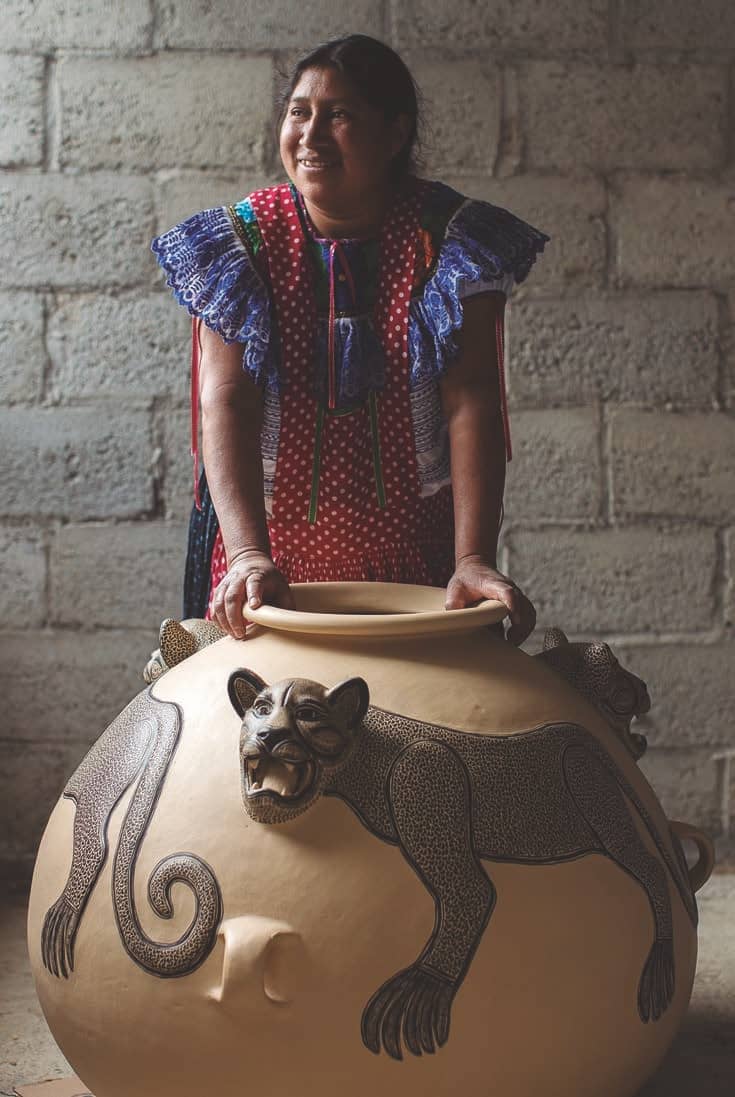 “¿Para que estás haciendo jaguares si no se van a vender? ” —le dijo un día su madre a Juana— “Solo estás perdiendo el tiempo, ¡mejor rómpelos y haz macetas!” Pero la pequeña Juana siguió reproduciendo la imagen felina que le habían inspirado sus libros de texto y hoy se ha convertido en una célebre artesana. Sus piezas se han exhibido en Estados Unidos, Inglaterra, Bélgica, España y Australia, y en el 2013 fue reconocida por la Fondo Cultural Banamex como una de las grandes artesanas del país. Su obra forma parte del libro Grandes Maestros del Arte Popular Iberoamérica, editado por la Fundación Cultural Banamex.