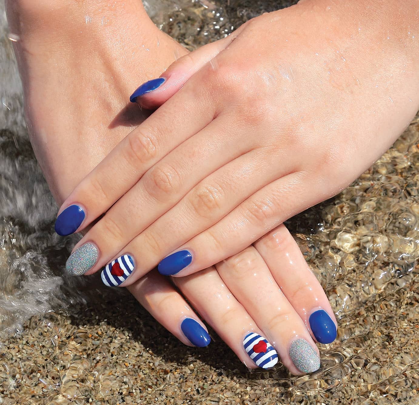 Add a splash of colour to your client’s fingertips this season. Paint one nail with blue and another with red, and apply white polish to the others to create a base. Against the white, play around with patterns and draw nautical prints such as stripes, dots and an anchor with the same blue and red shades. Finish with a top coat for a glossy effect.