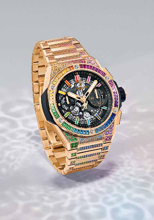 Among Hublot’s latest offerings are watches that push the boundaries of technical innovation, material experimentation and even blockchainled collectibility. Skeletonised chronographs clad in scratch-resistant gold and set with rainbow coloured gemstones; tourbillons housed in translucent neon yellow sapphire; pop art-inspired watches created with Japanese artist Takashi Murakami and sold with exclusive NFTs… the list is long and enthralling. “At Hublot, we must always seek to surprise,” says Guadalupe. “It’s the key element to our success.” Its fans have come to expect nothing less.
