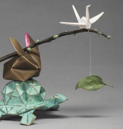Curious about his first folded crane, he decided to unfold it. Box says, “There was a star inside, just like I had been doing. It was an ‘aha!’ moment. There is the memory in the paper of every crease e that is made to create an animal. It’s symbolic of life. We make choices that determine the outcome. At the end, life unfolds and becomes a star, an accurate record of a life. It was a profound experience for me.”