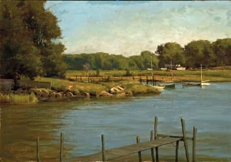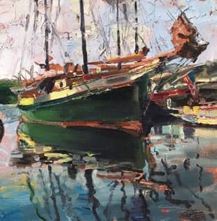 Donald Demers merges a similar past and present on the north shore of Boston in his painting The Old Essex. He comments, “The Essex River in Essex, Massachusetts, is the setting for this quiet, nostalgic and contemplative painting. The storied Essex River was the birthplace of many legendary Gloucester fishing schooners where they were built and launched from the yards of A.D. Story, Harold Burnham and the like. What was once a vibrant commercial shipbuilding center frenzied with the sounds and smells of wood, oakum, tar and such is now a serene and gentle backwater. As I painted the picture, I ruminated over the area’s previous character and role in maritime history.” The painting is in the traveling 18th National Exhibition of the American Society of Marine Artists (ASMA) of which he is a fellow.
