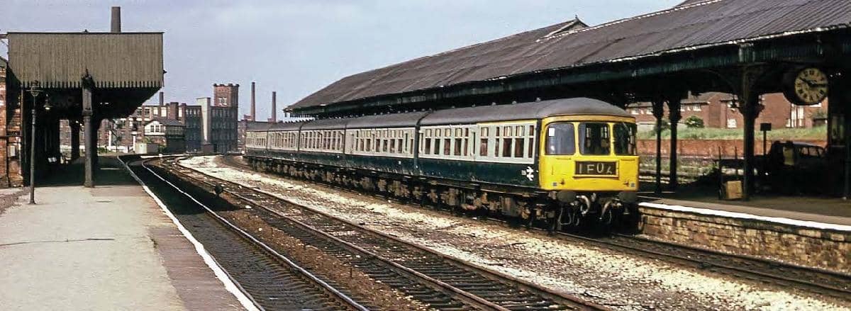 2: Built in 1960 as six-car sets, but here reduced to five-cars, the stylish Class 124s were powerful DMUs for tackling the demanding trans-Pennine routes from Liverpool/Manchester to Leeds/York/Hull and others. This set calls at Stalybridge on June 27, 1975 with the 09.10 Liverpool Lime Street-Hull. The station then still had its soot-covered canopies, but has a general run-down air that has been much improved through upgrades in the 1990s and 2000s.