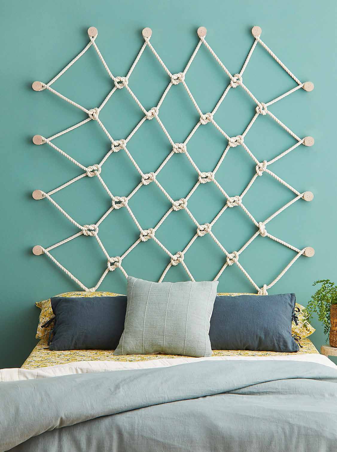 Who needs a conventional bedhead when you can create a nautical-inspired headboard using wood hooks and rope! You can use storebought hooks or make your own.