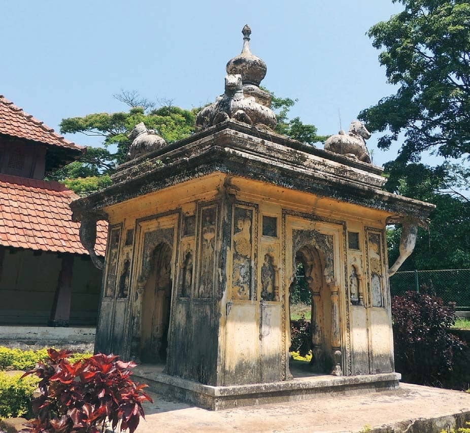 The Nalknad Palace is located about 40 kilometres from Madikeri or Mercara, the capital of Coorg during the 17th century, and was built during the reign of King Vira Rajendra. It was probably constructed as a safe haven for the king, who was then fighting Tipu Sultan. The Palace gets its name from four villages or naal-nad, in the local language, and is often referred to as the last refuge of the kings of Coorg. The four villages are small, and barely visible from the road, which ends abruptly at what appears to be a school, with no indication of a palace nearby. A closer look reveals that the school is built along a wall, which appears to be much older. A path alongside leads beyond the school, to an arched gateway which announces the presence of the Nalknad Palace. The arched gateway leads to a garden, with a small pavilion on one side. The pavilion is built of brick and stucco and resembles a shrine, with arched entrances on all four sides, a spire, and cows on the four corners of the roof, as is seen in local temples. The side walls have niches, with images of deities, of which only a few can be identified. One such image appears to be that of Krishna, while another depicts the Sun and the Moon.