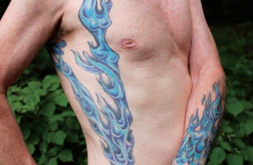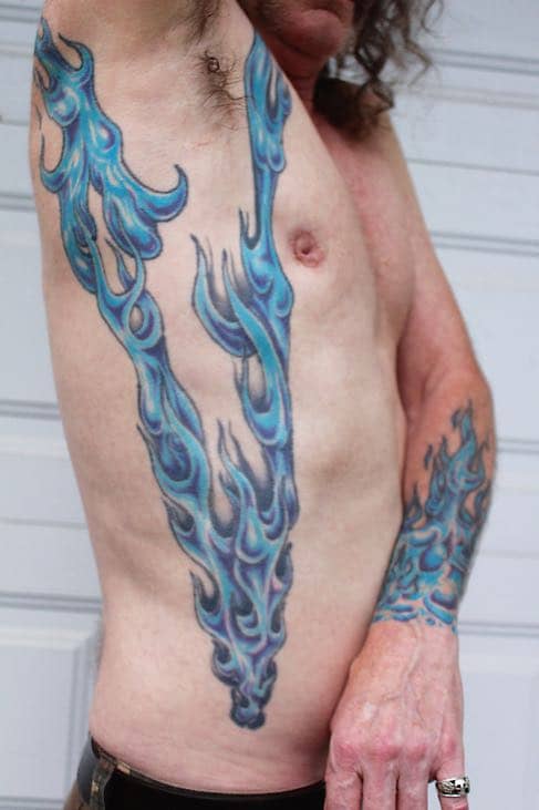 I was 40. I wanted inverted flames on my side, a fire burning up and out as to fit my body. More so a contour. The colors were chosen to fit my skin tone, the blues to match or reflect the veins in my arms/skin.