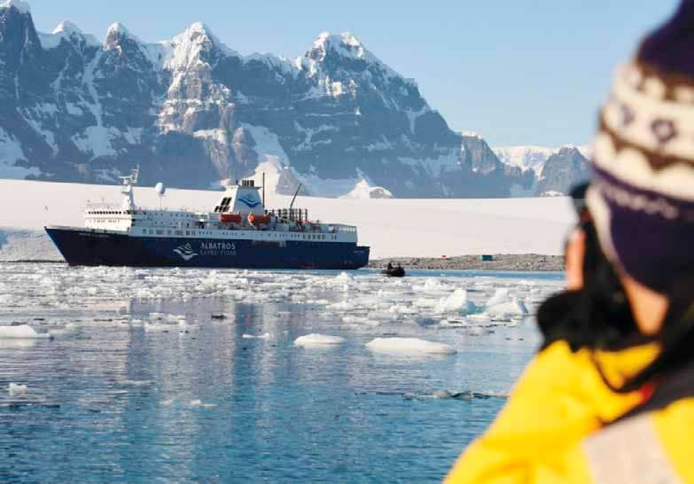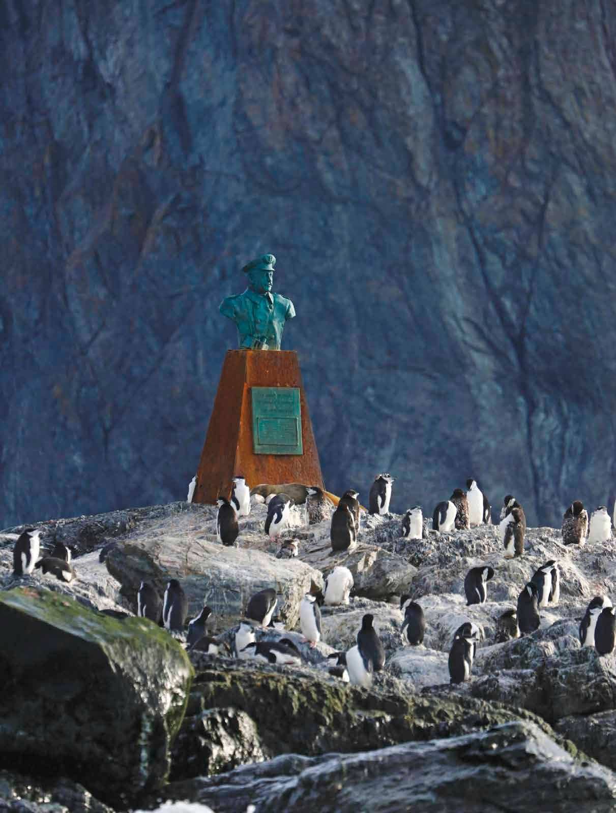 DESDE LA IZQ.: pingüinos barbijo en Point Wild, en isla Elefante, frente a un monumento al oficial naval chileno Luis Pardo, quien comandó el remolcador a vapor que rescató a 22 miembros de la tripulación de Shackleton en 1916; el barco de la expedición realiza un desembarco en tierra mientras los pasajeros exploran la costa en botes inflables zodiac. PÁG. ANT.: un témpano enorme flota en el mar de Weddell, visto desde la cubierta del buque de expedición mientras rodea la península Antártica.