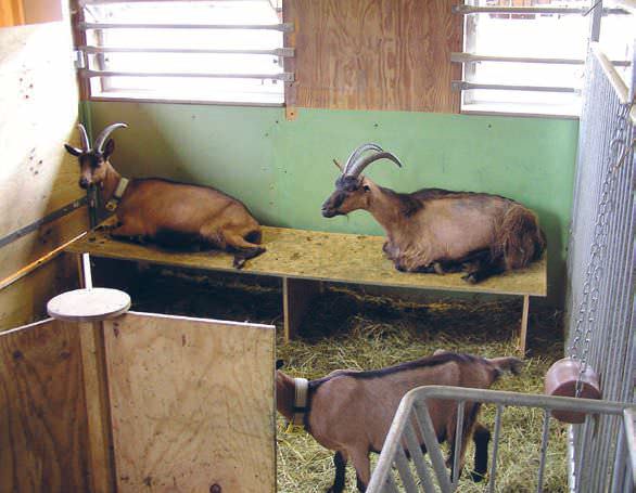 Unless your goats are the closest of friends or unusually mild-mannered, you’ll probably have noticed skirmishes around hay racks, troughs and within enclosed areas. This is due to goats’ natural social strategy of establishing a hierarchy to govern which goats have priority access to feed and prime locations. Subordinate goats are expected to keep their distance and out of the way of top ranking individuals. This is no problem at pasture, but it can cause conflict within the barn and around feed. In restricted areas, subordinates are not always able to get out of the way in time, and may even get trapped in a narrow space or dead end. The solution involves providing facilities that allow goats to take evasive action at any time. You can space out feeding and resting places, or provide furnishings that allow goats to avoid confrontations.
