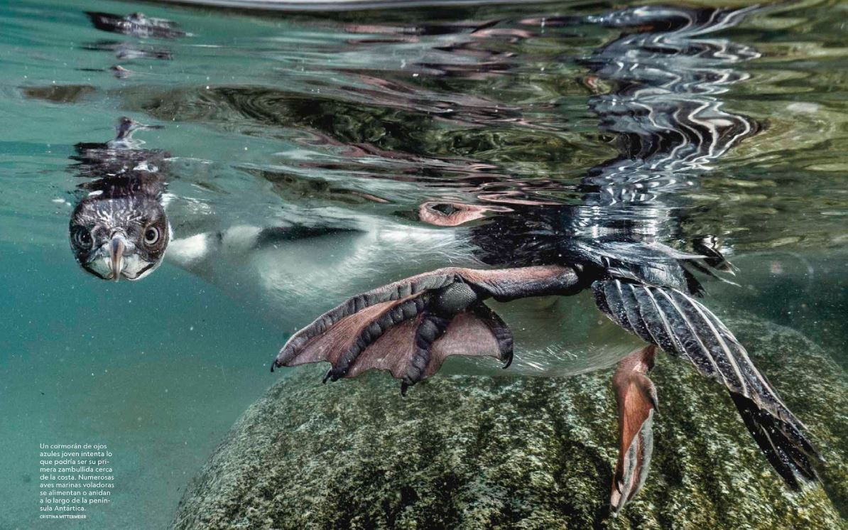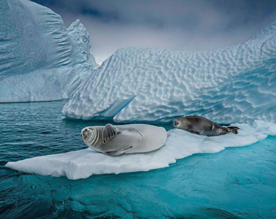 Las focas cangrejeras se deslizan sobre el hielo flotante para dormir, parir y ocultarse de las orcas o los leopardos marinos. Debido a la pérdida de hielo marino frente a la península Antártica, icebergs como este –desprendidos de los glaciares de tierra firme–, proporcionan lugares de descanso críticos para los animales. Pese a su nombre, las cangrejeras se alimentan principalmente de krill, otro alimento básico de la Antártida cuyo futuro está en duda. CRISTINA MITTERMEIER