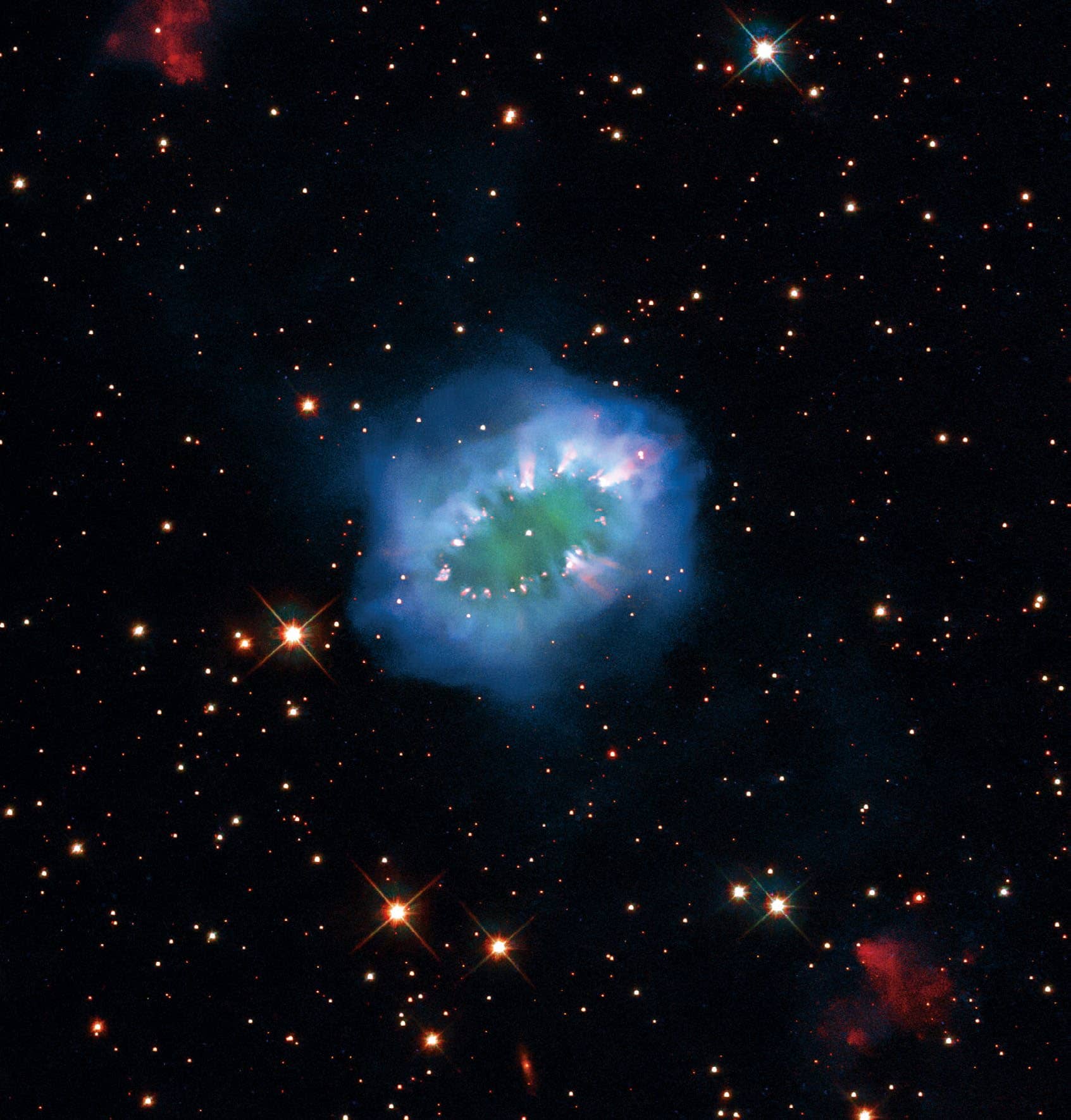 This process caused the expulsion of vast quantities of gas and dust, which now forms the ring that gives the Necklace Nebula its famous shape.