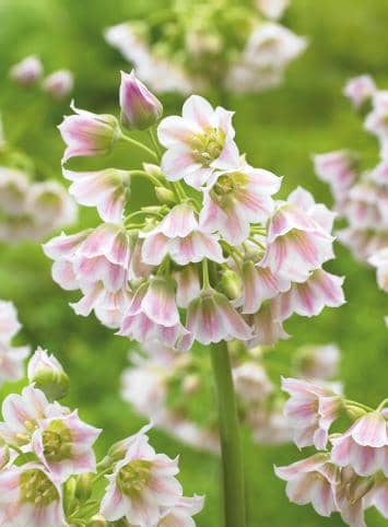 This species bulb, listed under both names, has rubbery stems topped with elegant clusters of outward-facing, rose-pink flowers in April and early May. These fade to parchment by midsummer. It’s truly perennial, although it increases rather slowly. Height: 4ft