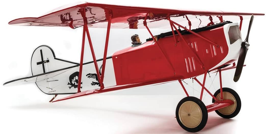 This built-up model features a scale replica engine, sprung wooden tail skid and shock-absorbing main gear, a detailed cockpit with a pilot and instrument panel, machine guns, functional flying wires, 8-inch vintage wheels, and UltraCote covering. It is intended for a 30 to 60cc gas or glow engine or equivalent electric motor.